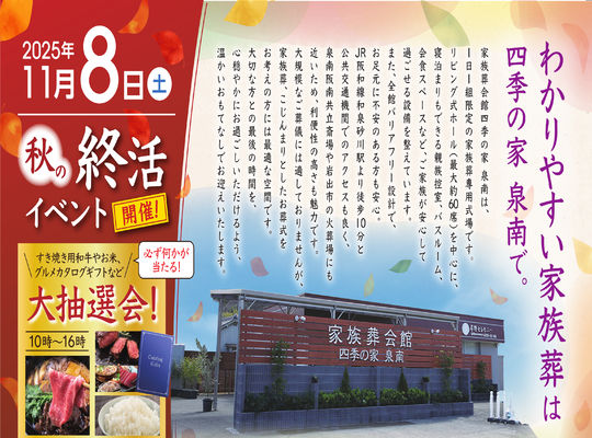 2025/10/20家族葬会館四季の家泉南からイベント開催のお知らせです! 家族葬会館四季の家泉南は地域の方に選ばれて7周年を迎えました。常日頃から地域への貢献をしたいと... -