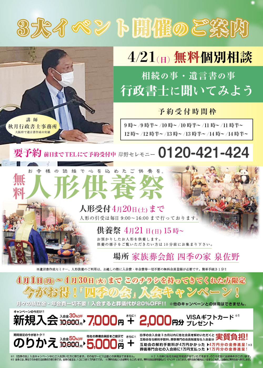 2024年4月人形供養・相続セミナー・入会キャンペーンのご案内.家族葬会館四季の家泉佐野